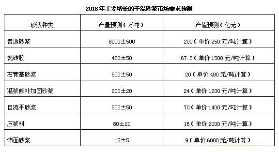 2013年,由于年初大面積、長時間的霧霾事件,引起了政府的高度重視,從國務院到各省市政府紛紛出臺大氣污染防治政策。“建筑揚塵”成為眾矢之的,禁止 現場攪拌砂漿的力度提升到前所未有的高度。從發展趨勢來看,無論建筑市場如何波動,干混砂漿都將保持兩位數的增長。未來幾年期內,我國干混砂漿市場將有一 個較快幅度的穩定增長。經匯總專家、顧問意見,采用類比法、德菲爾法等綜合測算, 2018年各類砂漿市場預測統計: